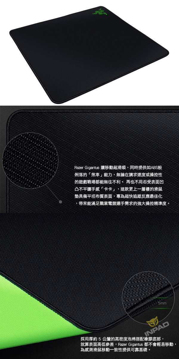 Razer 雷蛇 Gigantus Elite布質鼠墊 【商品介紹】 超大滑鼠墊面積專為低靈敏度滑鼠掃掠設計 【商品特色】 1、橡膠底部帶來最佳化使用舒適