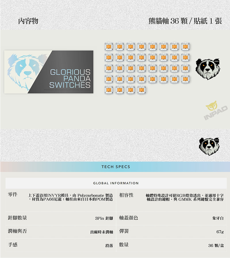 Glorious Panda沿用原始INVYR熊貓軸模具,對內部結構加以改良,並採用最頂尖的物料製造—帶來極佳的手感。取原始熊貓軸之精華,去其槽粕,採用世界各地的精良零件組合而成,帶來熱刀入牛油般順滑鍵程,明確而圓潤的段落觸感和天籟般鍵擊聲響。