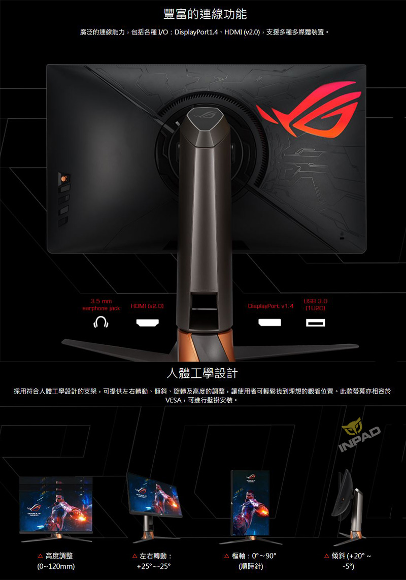 | I/O連接埠: | DisplayPort 1.4 x 1 HDMI(v2.0) x 1 USB Hub:Yes(2 ports USB 3.0) 耳機插孔:有 |