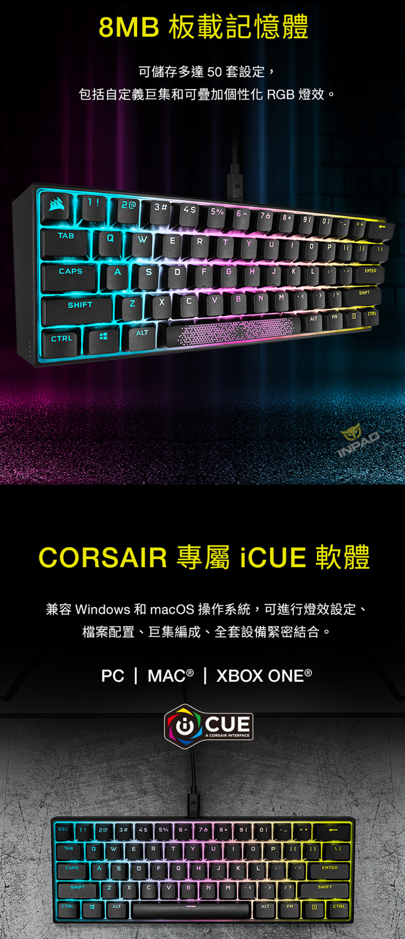 | 品名: | Corsair 海盜船 K65 RGB MINI 60%機械式鍵盤 |