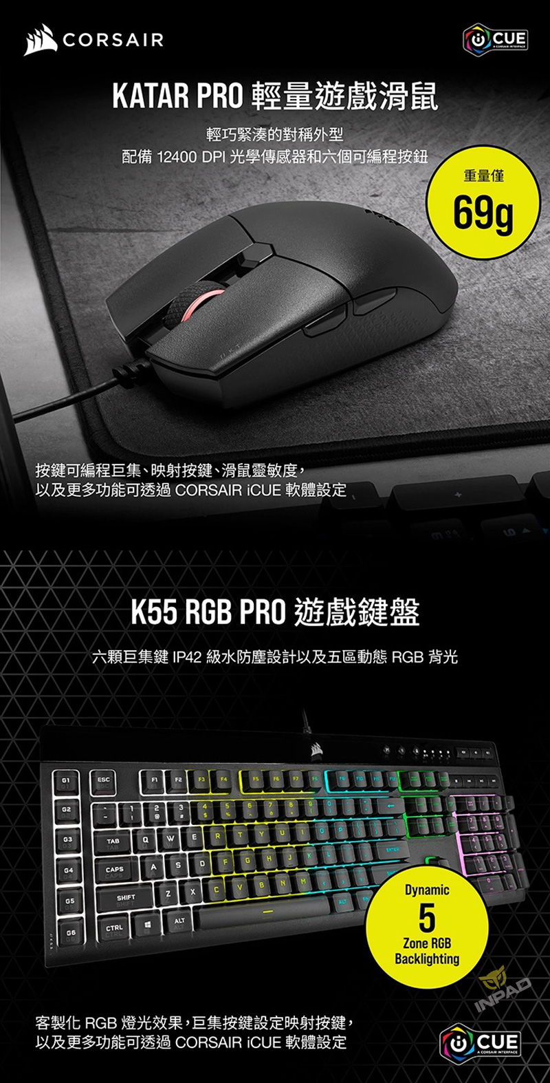 Corsair Gaming 海盜電競 K55 RGB PRO 薄膜式鍵盤 中文+KATAR PRO滑鼠 鍵鼠組