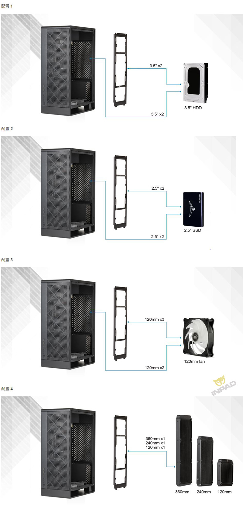 | 硬碟空間: | 隱藏:2.5" or 3.5" x 4 (側面無安裝風扇或水冷排的情況) |