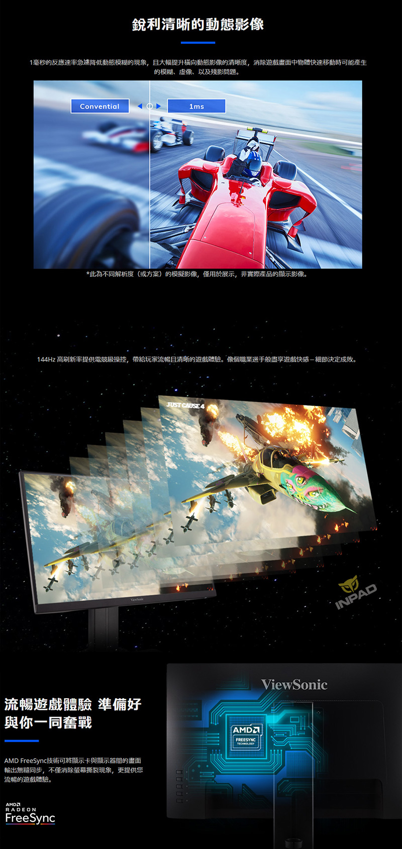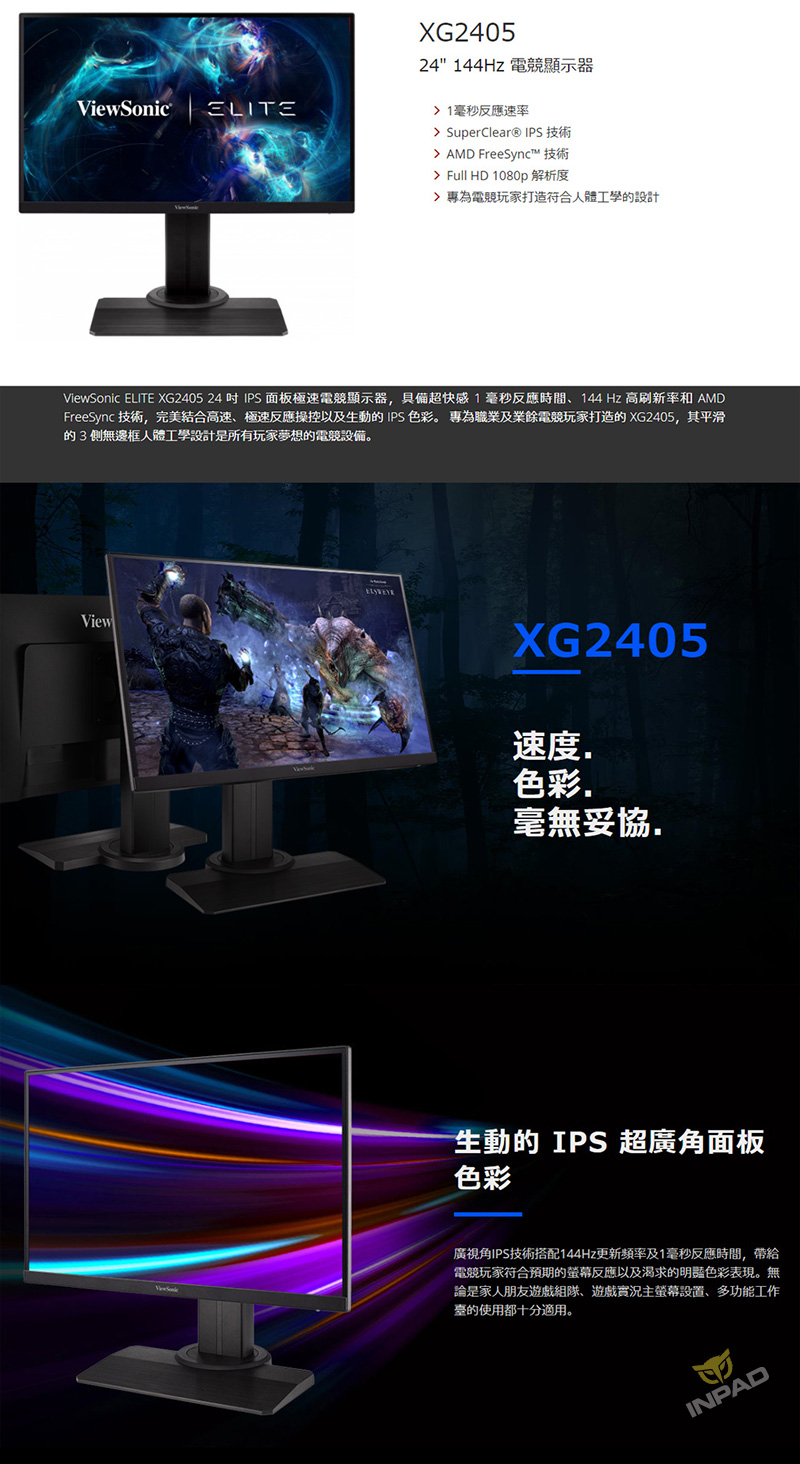 ViewSonic XG2405 24 吋 IPS 面板極速電競顯示器,具備超快感 1 毫秒反應時間、144 Hz 高刷新率和 AMD FreeSync Premium 技術,完美結合高速、極速反應操控以及生動的 IPS 色彩。 專為職業及業餘電競玩家打造的 XG2405,其平滑的 3 側無邊框人體工學設計是所有玩家夢想的電競設備。