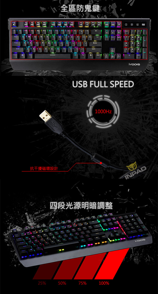 i-Rocks 艾芮克 K60M PLUS RGB軸 機械式鍵盤 中文 【商品介紹】 K60M Plus 機械鍵盤外觀採用金屬精緻工藝及懸浮鍵帽設計,搭配1680萬多彩RGB背光特效功能,讓產品更有看頭。每顆按鍵獨立的機械開關設計,耐用性及打感更加提升,除內定功能鍵外,使用者更可以下載搭配應用軟體,自由的修正調整想要的背光及快速鍵功能。 【商品特色】 1、機械開關設計,提供舒適耐用的按鍵手感