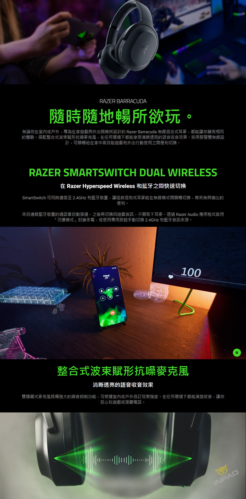 無論你在室內或戶外,專為在家遊戲與外出娛樂所設計的 Razer Barracuda 無線混合式耳麥,都能讓你擁有相同的體驗。搭配整合式波束賦形抗噪麥克風,在任何環境下都能享受清晰透亮的語音收音效果。採用智慧雙無線設計,可順暢地在家中高效能遊戲和外出行動使用之間便利切換。