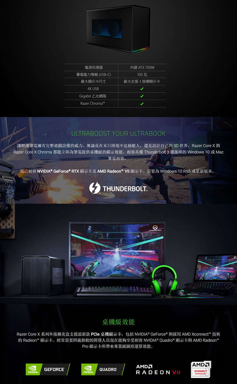 | 手提電腦使用需求(不隨附手提電腦)): | 。連接至電腦 系統必須具有一個 Thunderbolt™ 3 連接埠並且支援外接顯示卡。 請與手提電腦製造商確認你的手提電腦是否支援 Thunderbolt 3 外接顯示卡。 連接 Razer Core X Chroma 前,請同時確認你的手提電腦已安裝最新版的 BIOS、韌體、Thunderbolt 軟體與其他需事先安裝的更新。 。macOS 系統需求 使用 macOS High Sierra 10.13.4 或以上版本作業系統,且具備 Thunderbolt™ 3 的 Mac 電腦。 相容的 AMD 顯示卡需另外購買。 Razer Synapse 3 軟體不適用於 macOS。 。Windows 系統需求 使用 Windows 10 64 位元 RS5 或以上版本作業系統,且具備 Thunderbolt™ 3 連接埠。 相容的 NVIDIA 或 AMD 顯示卡需另外購買。 |