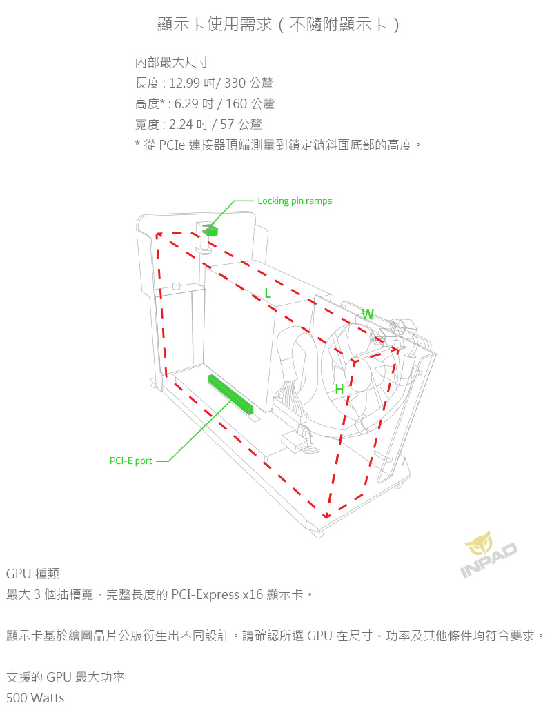 | 顯示卡使用需求(不隨附顯示卡): | 。內部最大尺寸 長度 : 12.99 吋/ 330 公釐 高度* : 6.29 吋 / 160 公釐 寬度 : 2.24 吋 / 57 公釐 * 從 PCIe 連接器頂端測量到鎖定銷斜面底部的高度。 。GPU 種類 最大 3 個插槽寬、完整長度的 PCI-Express x16 顯示卡。 顯示卡基於繪圖晶片公版衍生出不同設計。請確認所選 GPU 在尺寸、功率及其他條件均符合要求。 。支援的 GPU 最大功率 500 Watts |