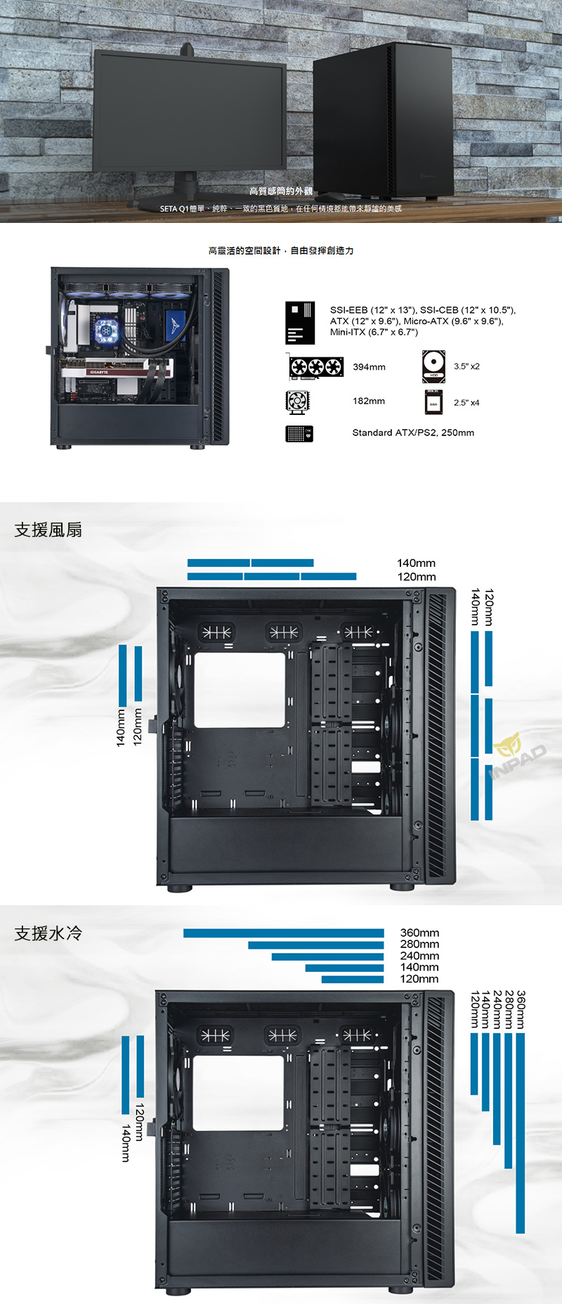 | 支援水冷: | 前方:120mm / 140mm / 240mm / 280mm / 360mm 背部:120mm / 140mm 上方:120mm / 140mm / 240mm / 280mm / 360mm |