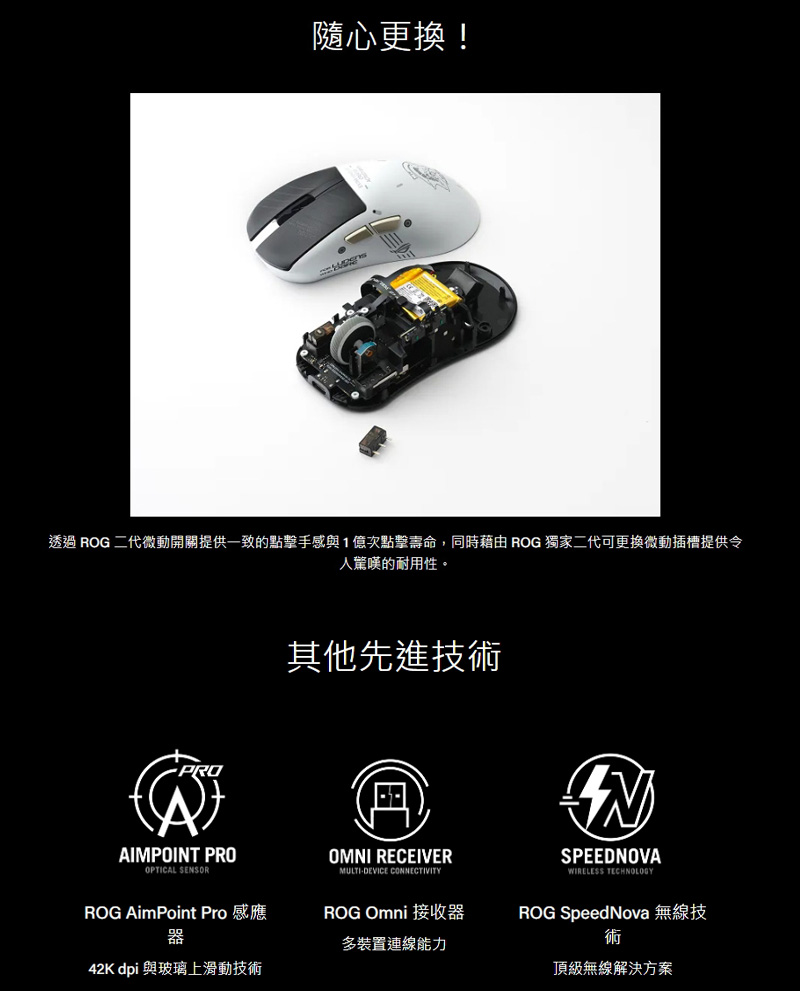 2、ROG 二代微動開關:清脆的點擊感,具有卓越的 1 億次點擊壽命